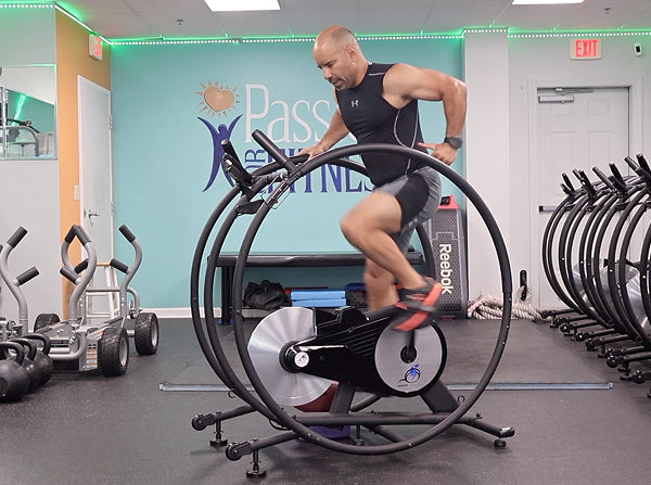 Some online clients choose to integrate the Cycle360Trainer into their program. When available, it is used as a tool for low-impact conditioning, rotational work, posture, and trunk stability.